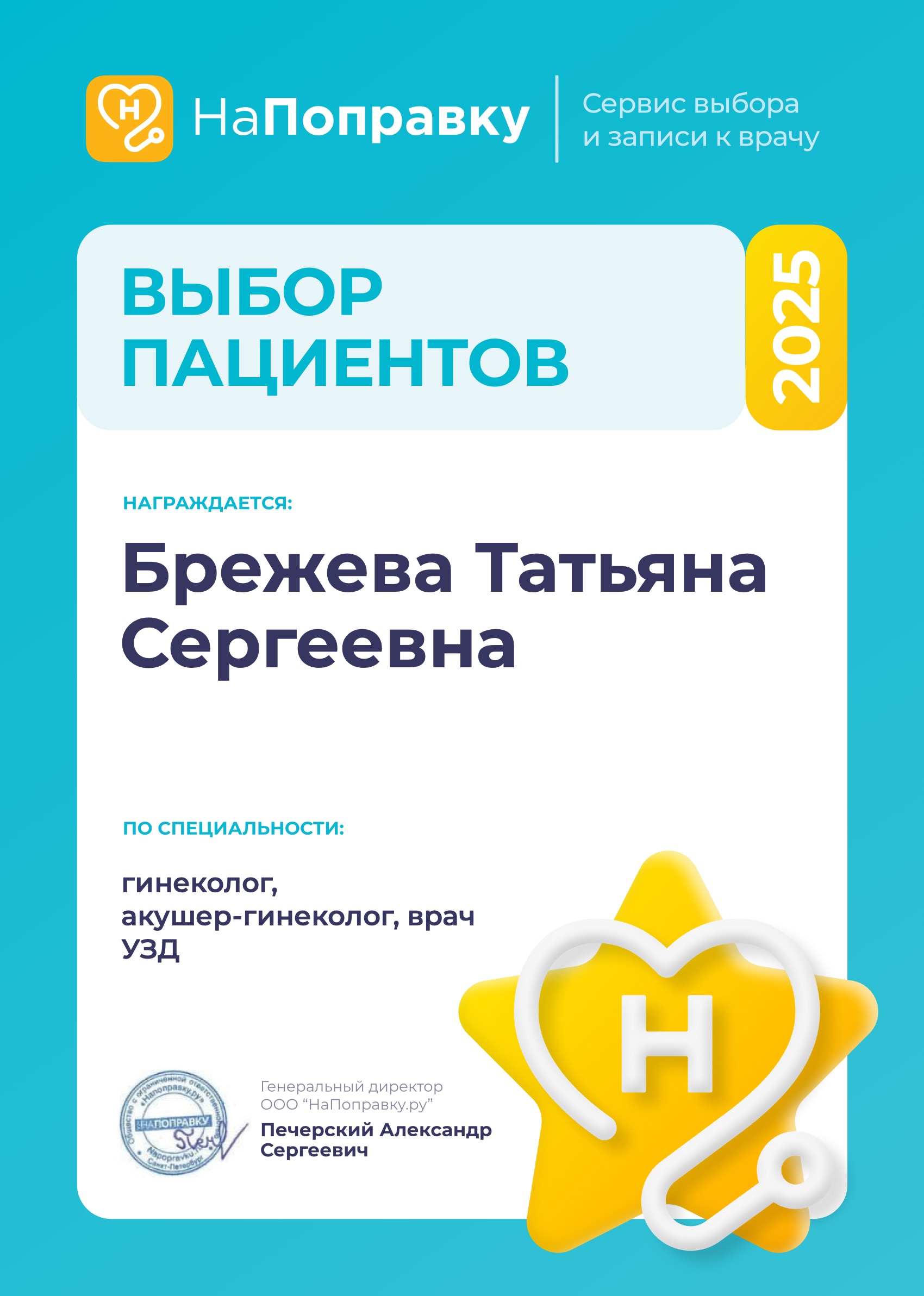Аккредитация от 28.10.2025 по специальности "Акушерство и гинекология", уникальный номер реестровой записи 7725.033498435, ФГБОУ ДПО "Российская медицинская академия непрерывного профессионального образования" Минздрава РФ
