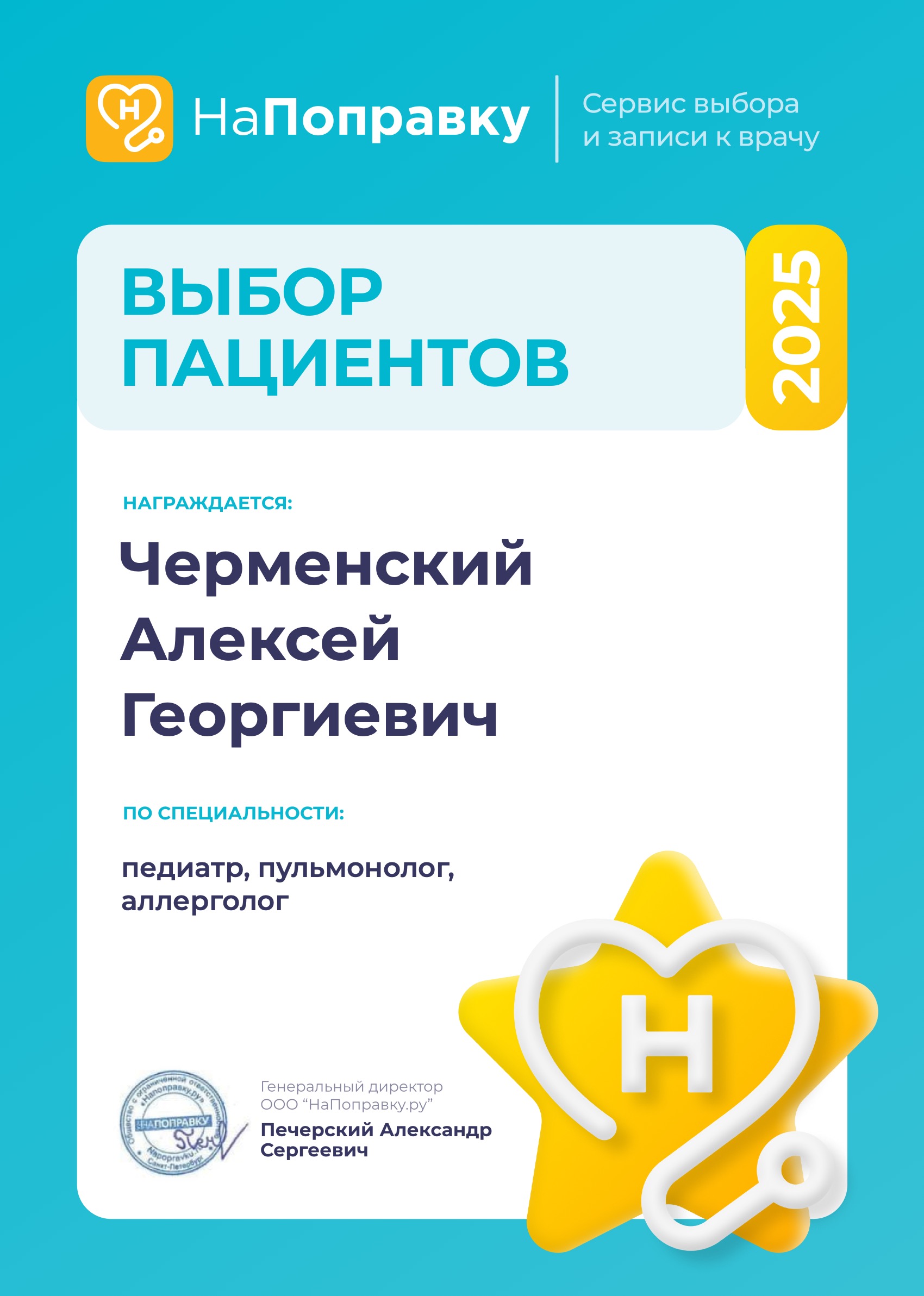 Диплом «Выбор пациентов 2025» от портала «НаПоправку» присужден детскому и взрослому аллергологу, пульмонологу, педиатру, к.м.н. Черменскому Алексею Георгиевичу