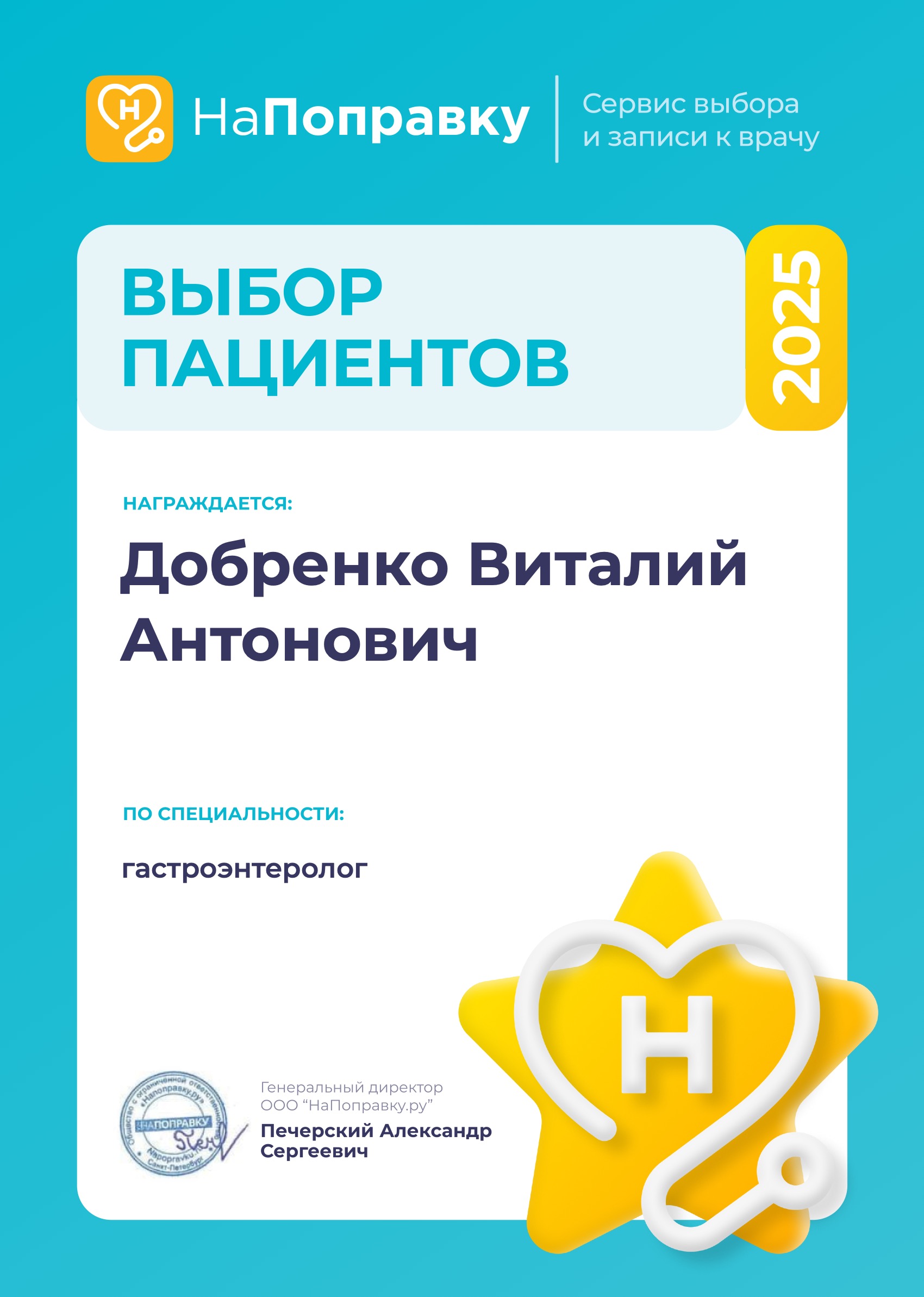 Аккредитация от 28.10.2025 по специальности "Гастроэнтерология", уникальный номер реестровой записи №7725.033504583, ФГБОУ ДПО "Российская медицинская академия непрерывного профессионального образования" Минздрава РФ