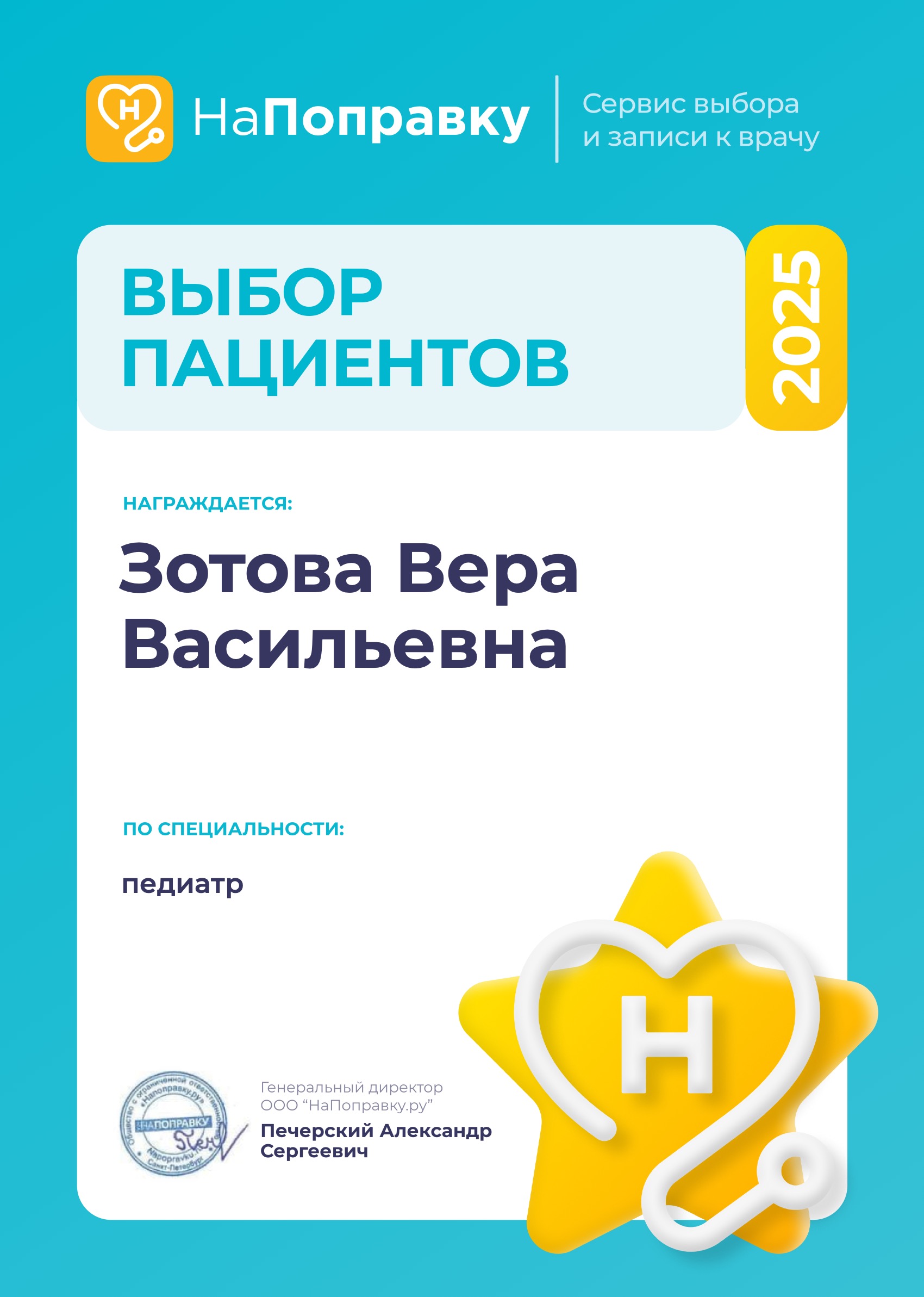 Диплом «Выбор пациентов 2025» от портала «НаПоправку»