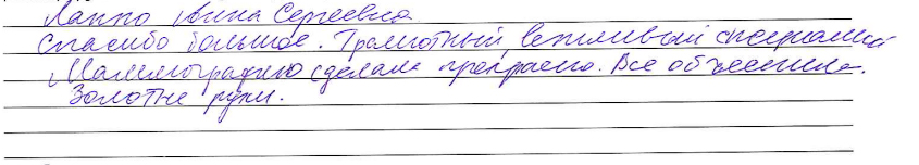 Благодарю врача ультразвуковой диагностики Камалову Альмиру Минигалеевну за прекрасный приём. Деликатный и грамотный специалист. Спокойно отвечала на все мои вопросы в ходе приёма. Подробно объяснила результаты исследования, тем самым избавила меня от страхов за своё здоровье в области щитовидной железы.